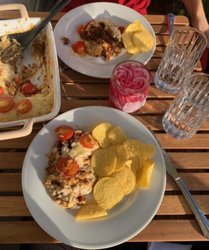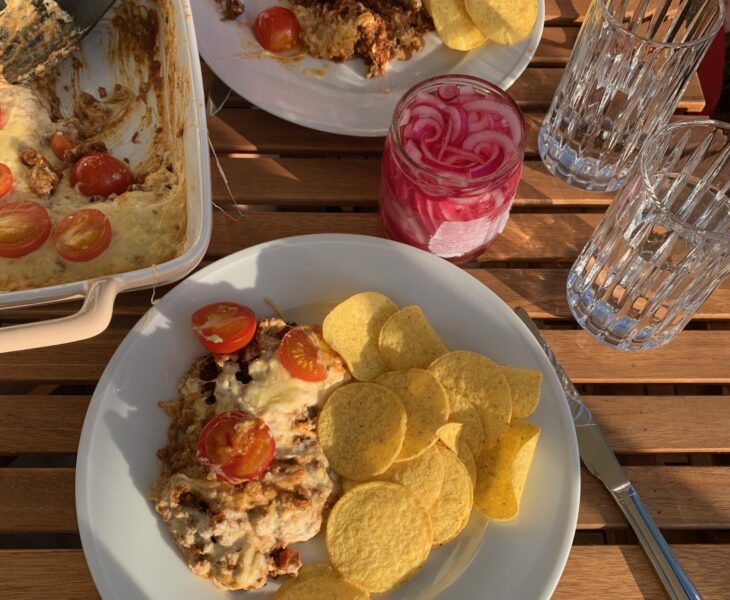 En väldigt god tacogratäng. Picklad rödlök passar bra till.